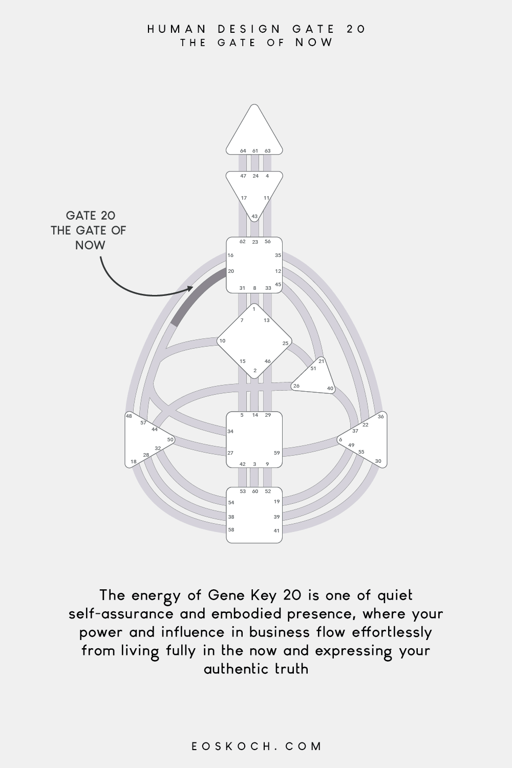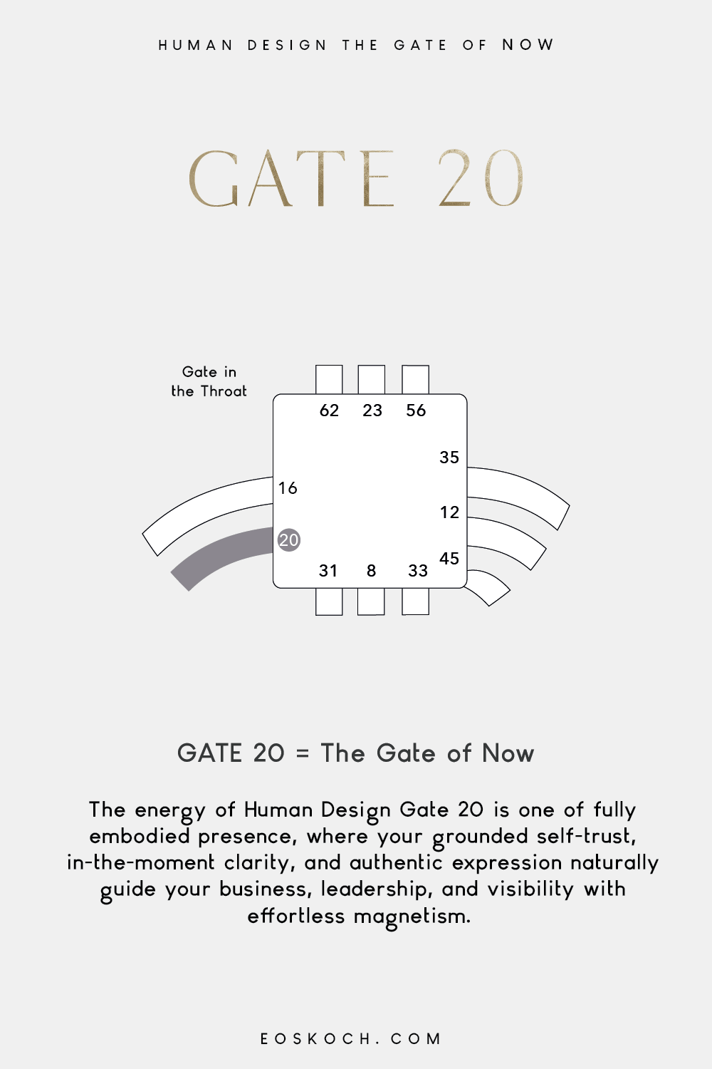 “The energy of Human Design Gate 20 is one of fully embodied presence, where your grounded self-trust, in-the-moment clarity, and authentic expression naturally guide your business, leadership, and visibility with effortless magnetism.”