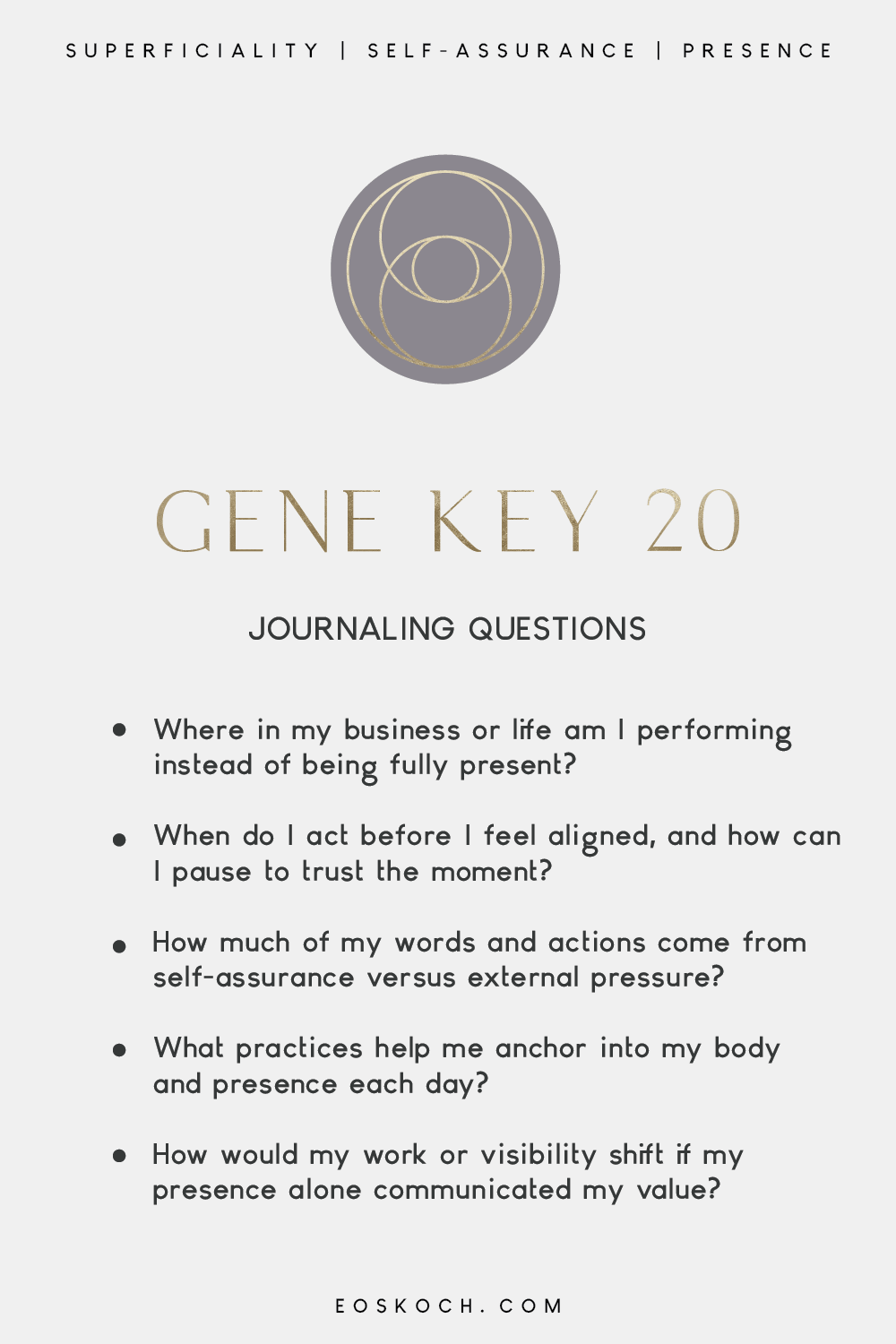 “The energy of Gene Key 20 is one of quiet self-assurance and embodied presence, where your power and influence in business flow effortlessly from living fully in the now and expressing your authentic truth.”