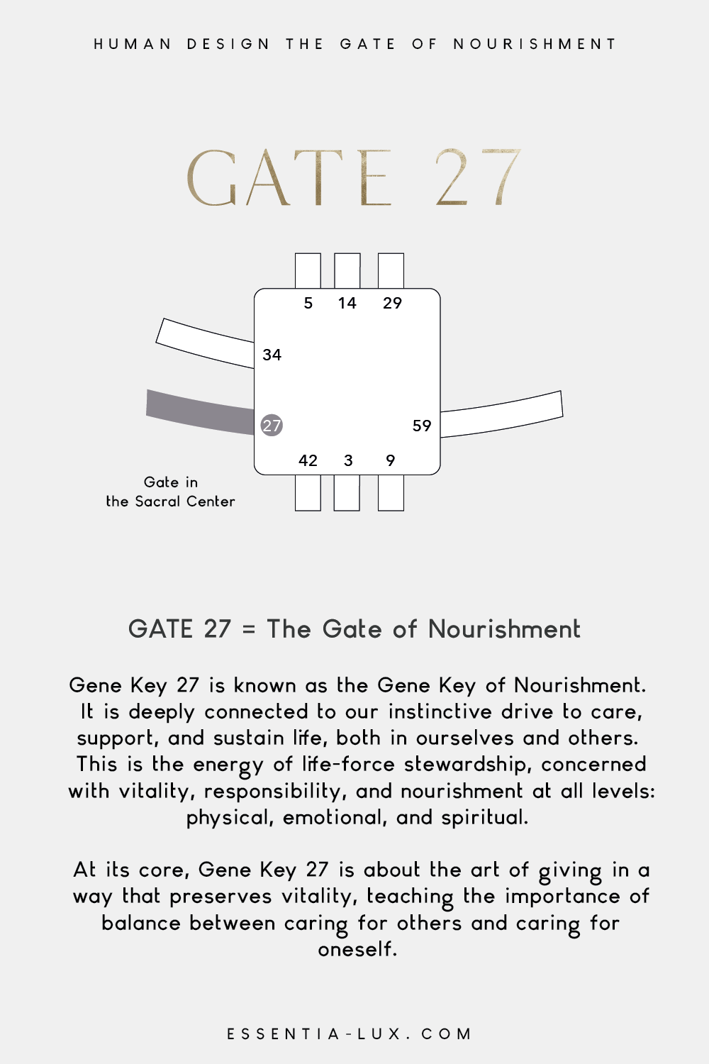Gate 27 is known as the Gate of Caring or the Gate of Nourishment, and it resides in the Sacral Center, which is the center of life force energy, work energy, and sustaining vitality. This gate is deeply concerned with care, support, and nurturing, both in the physical and emotional sense. Its core energy revolves around providing for others, ensuring their well-being, and creating a sense of safety and abundance.