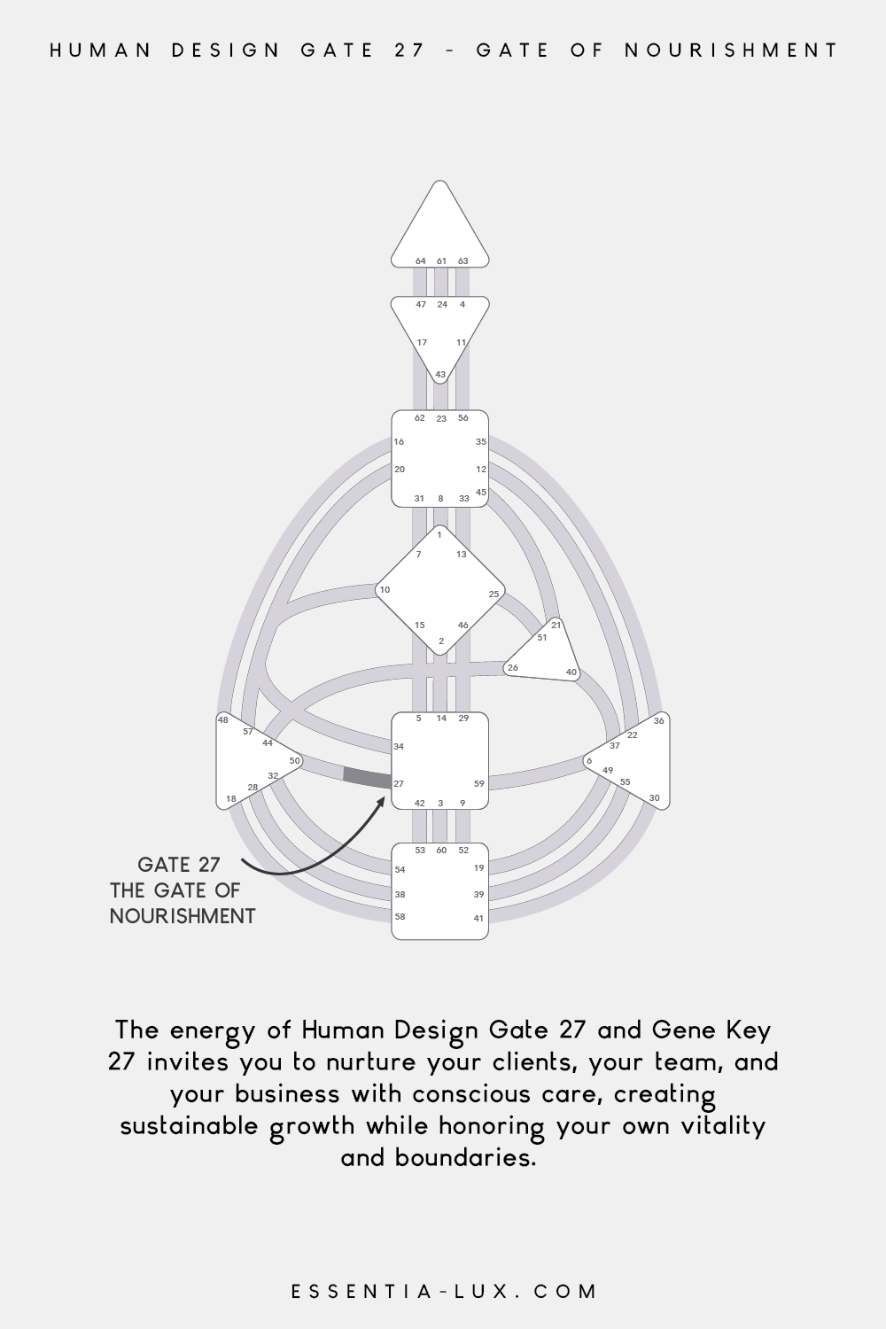 By integrating the wisdom of Gate 27 and Gene Key 27, your business becomes a vessel of empowerment, care, and aligned abundance, allowing you to lead with both heart and sovereignty.