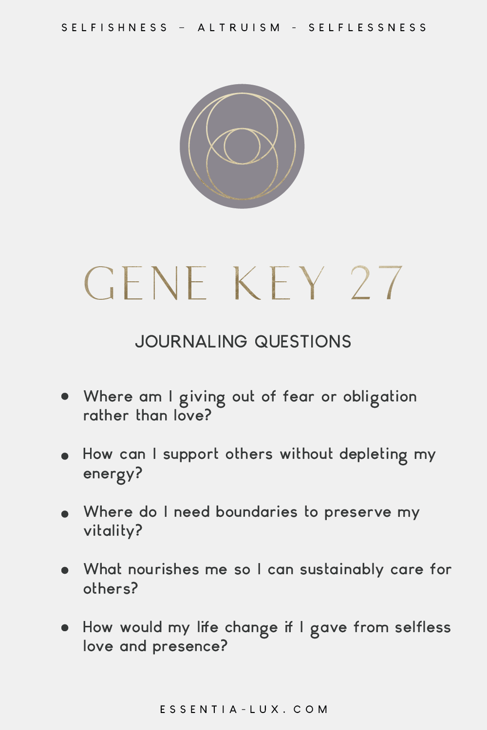 At its core, Gene Key 27 is about the art of giving in a way that preserves vitality, teaching the importance of balance between caring for others and caring for oneself.
