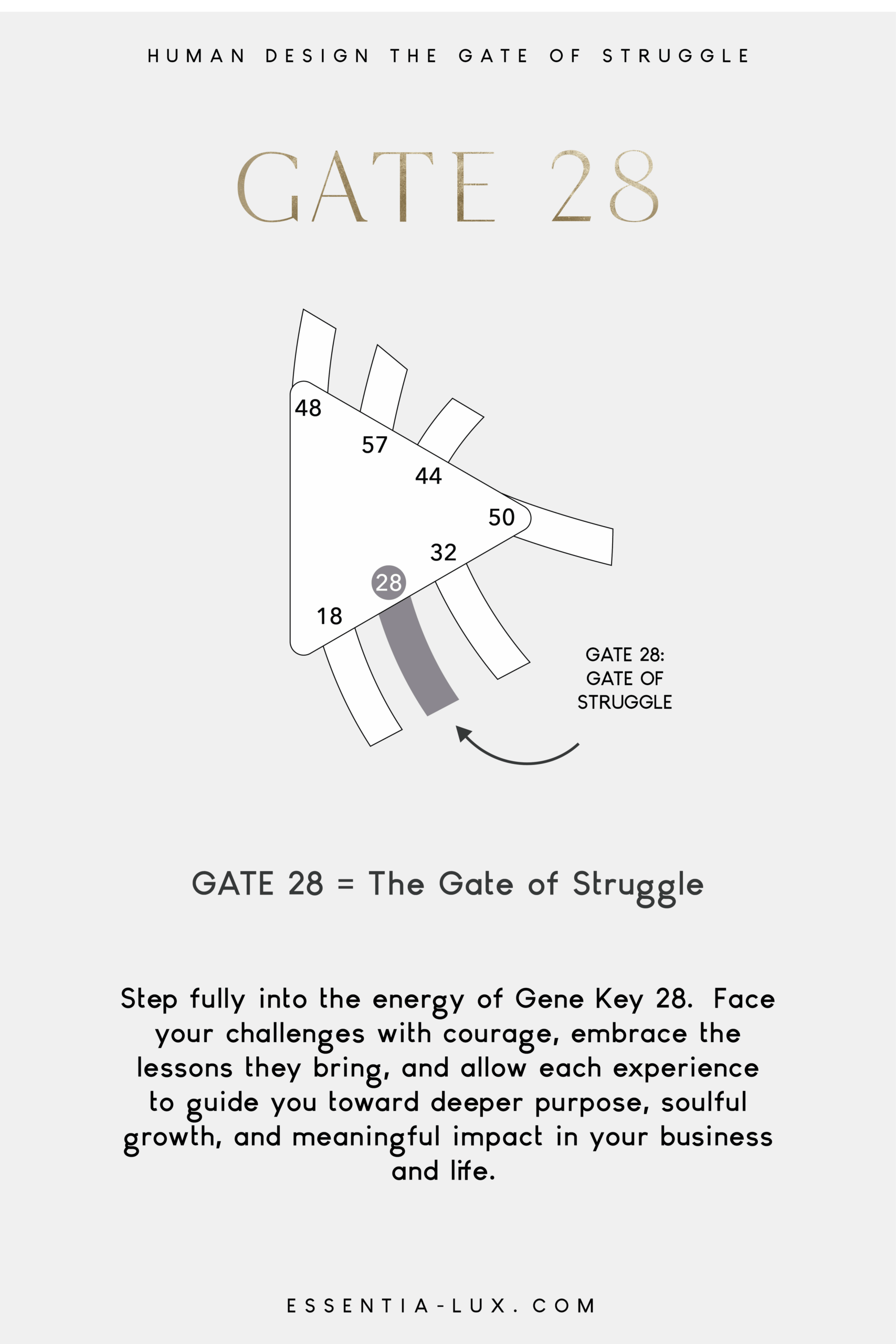 The energy of Human Design Gate 28 is one of courageously embracing challenges in your business, transforming fear and struggle into purpose, resilience, and soulful impact.