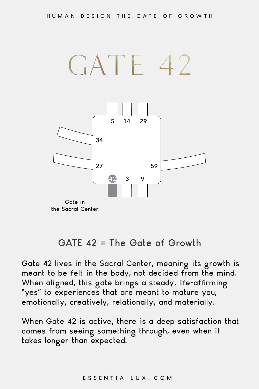 Gate 42 lives in the Sacral Center, meaning its growth is meant to be felt in the body, not decided from the mind. When aligned, this gate brings a steady, life-affirming “yes” to experiences that are meant to mature you, emotionally, creatively, relationally, and materially.