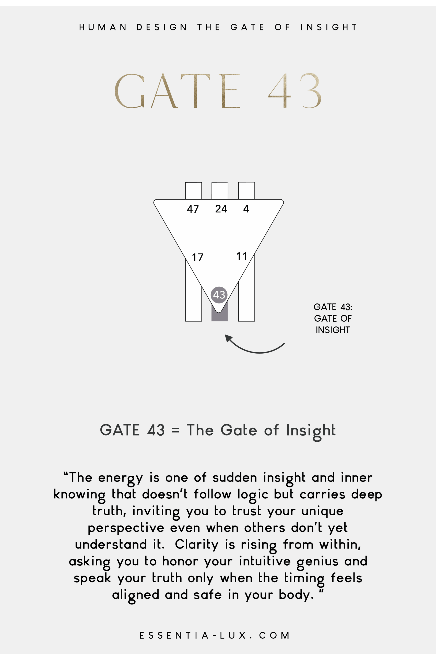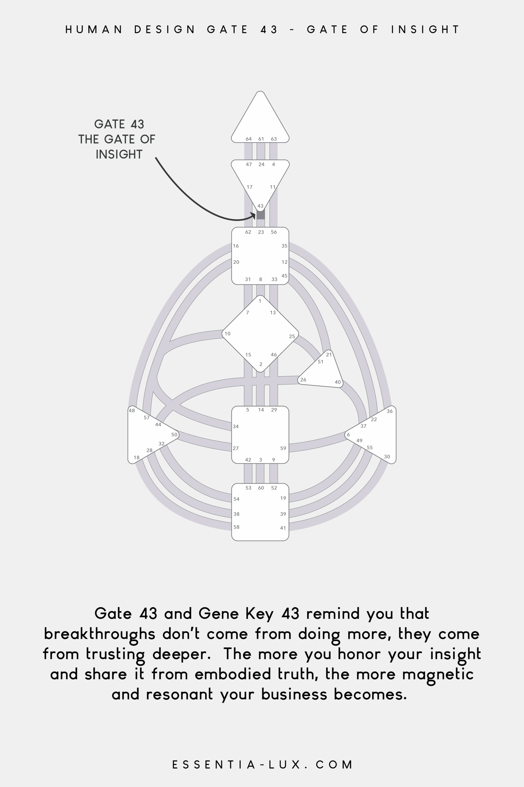 “Human Design Gate 43 carries the energy of breakthrough insight and intuitive genius, guiding you to trust your unique inner knowing, speak only when the timing is right, and lead your soulful business with clarity, originality, and quiet confidence.”