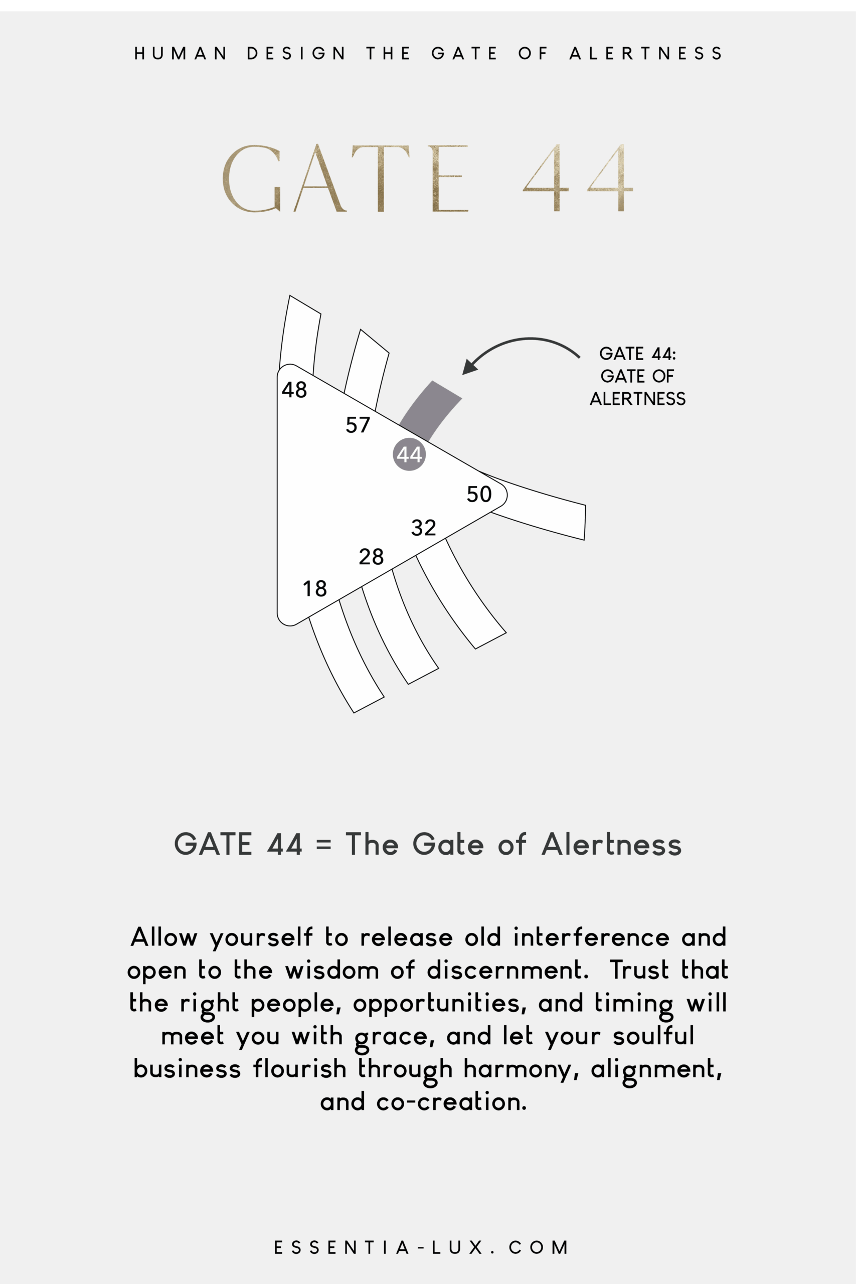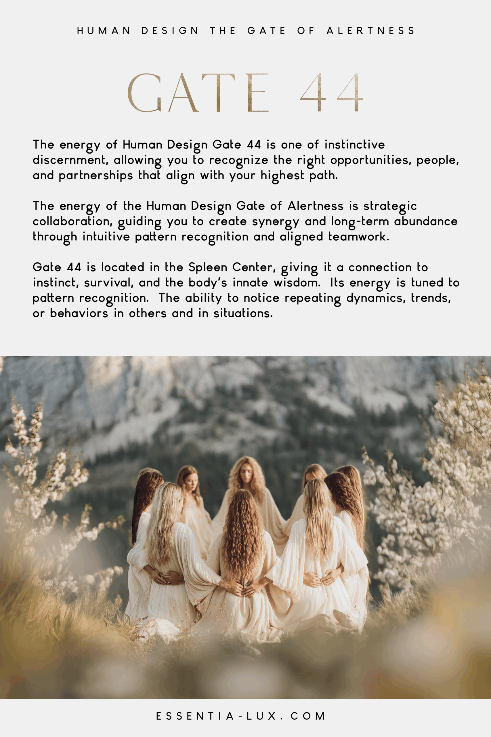 The energy of Human Design Gate 44 is one of instinctive discernment, allowing you to recognize the right opportunities, people, and partnerships that align with your highest path.