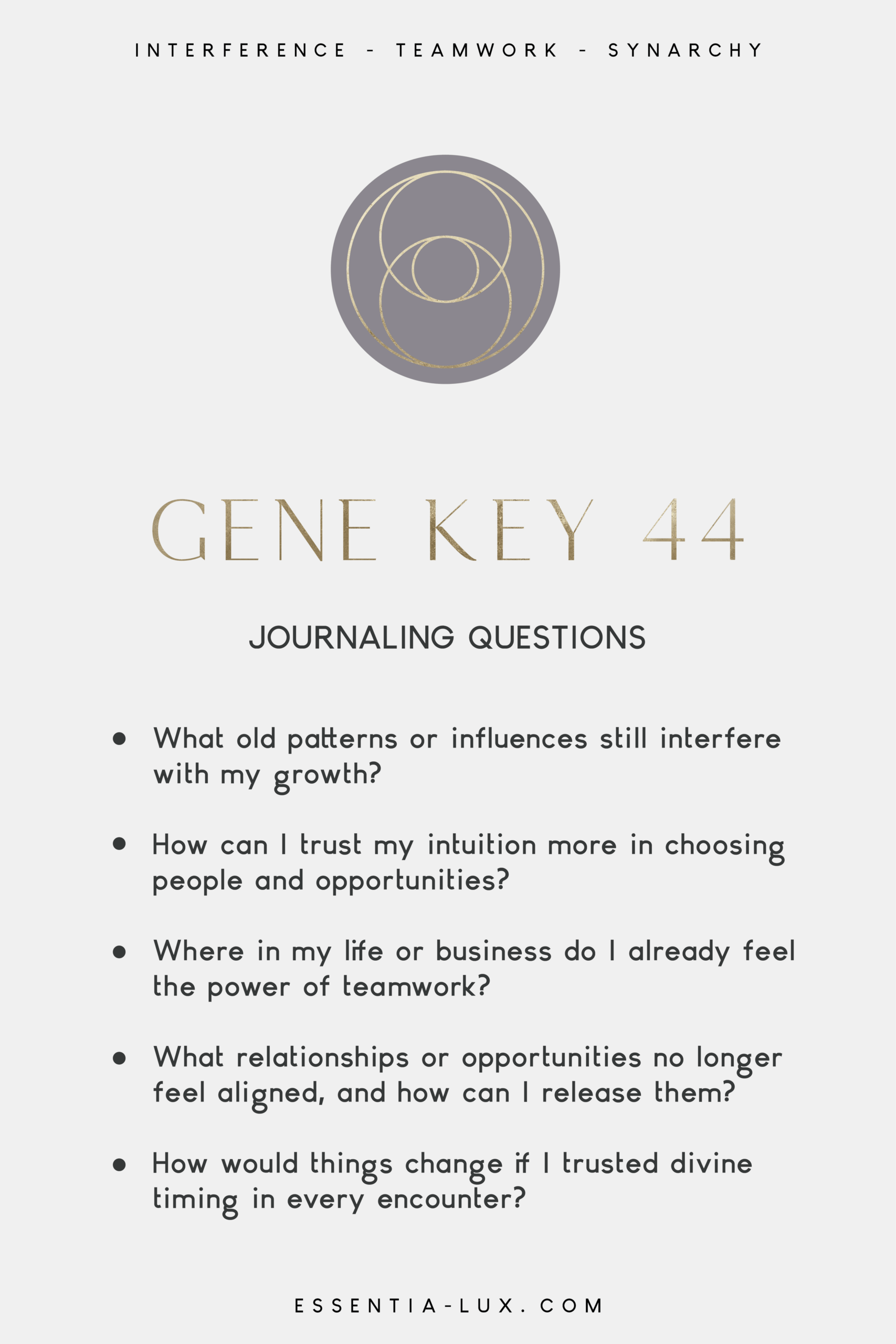 Gene Key 44 invites you to trust your intuitive discernment, releasing old patterns so you can align with the people and opportunities that create harmony and abundance.