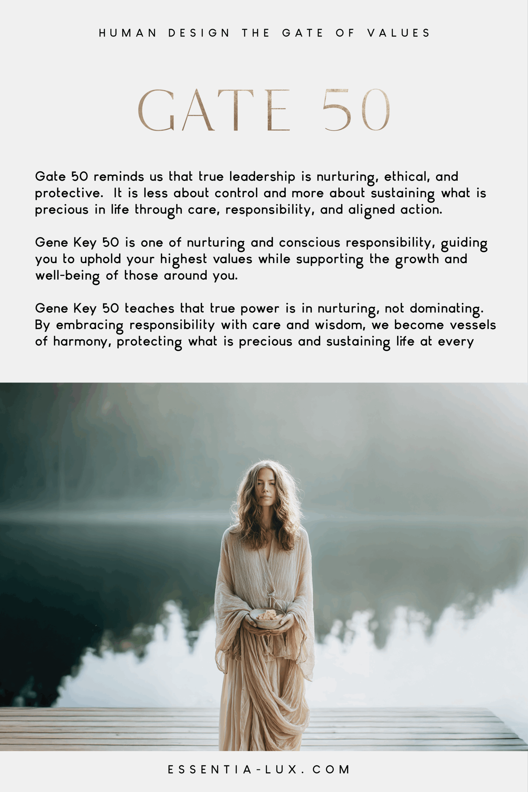 The energy of Gate 50 and Gene Key 50 in your soulful business is one of nurturing, conscious responsibility, guiding you to uphold your values while creating a space where your clients and community can thrive.