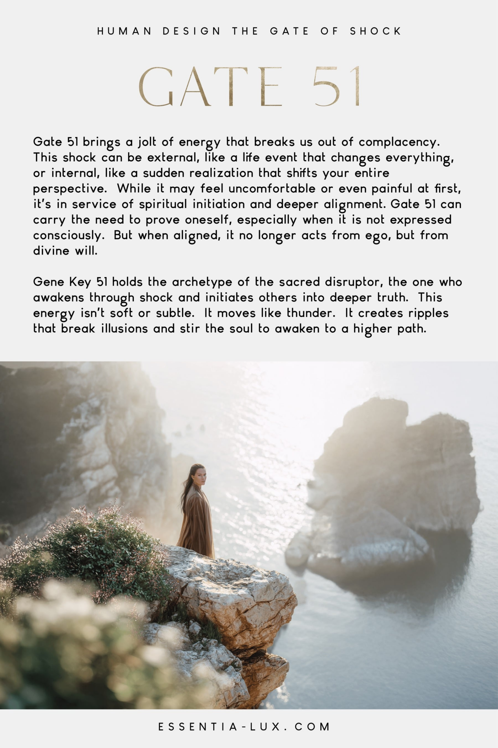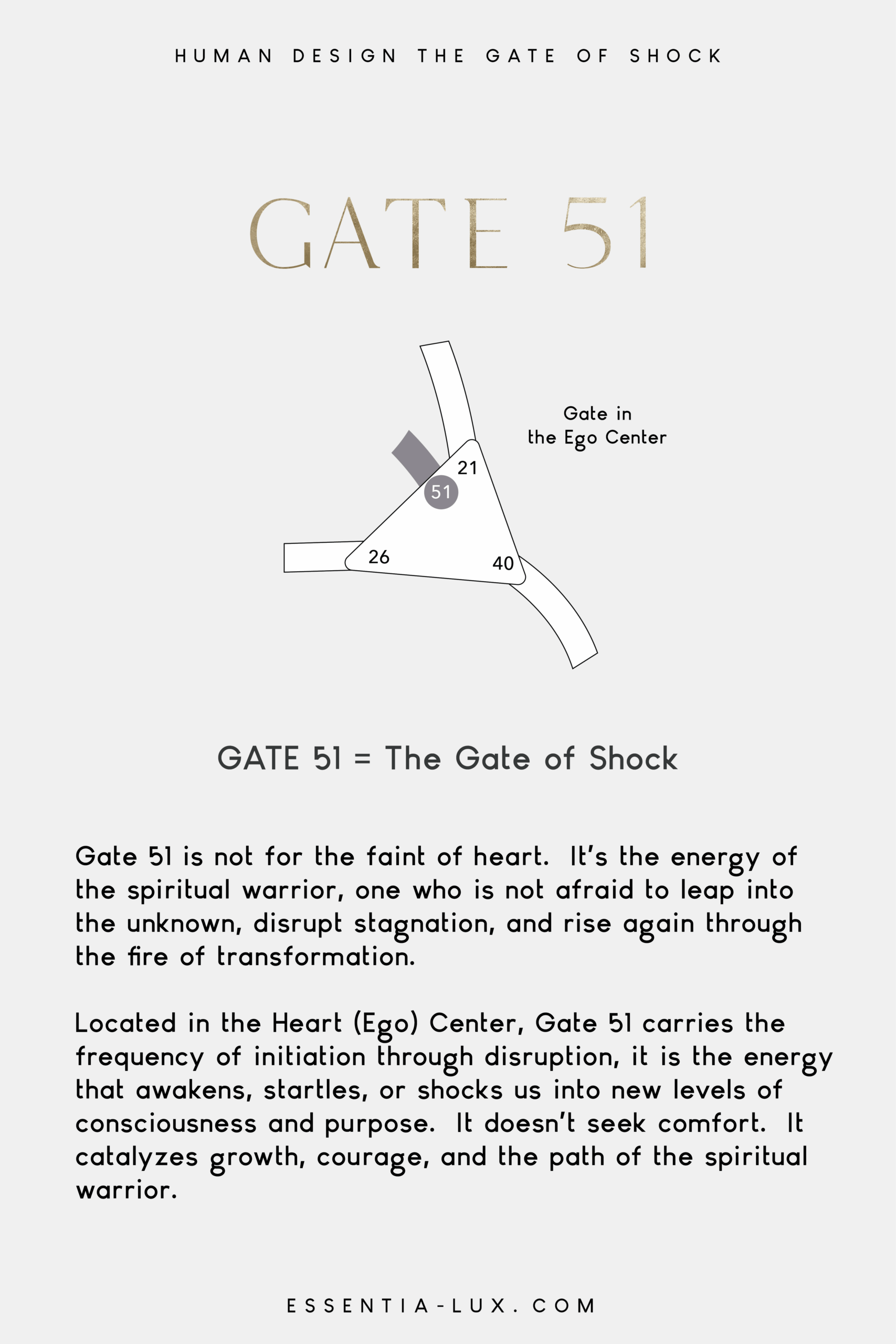 Gate 51 is not for the faint of heart. It’s the energy of the spiritual warrior, one who is not afraid to leap into the unknown, disrupt stagnation, and rise again through the fire of transformation.
