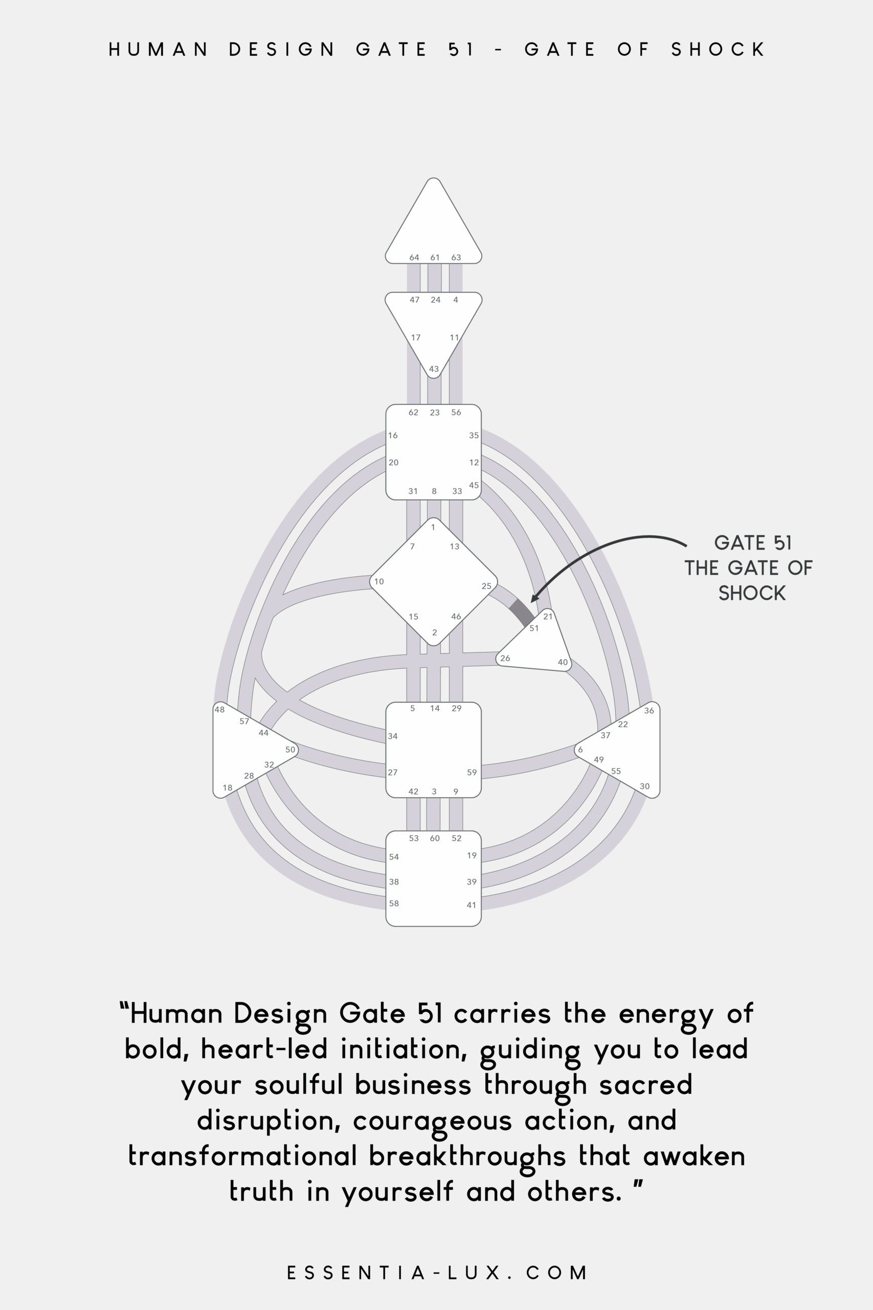 “Human Design Gate 51 carries the energy of bold, heart-led initiation, guiding you to lead your soulful business through sacred disruption, courageous action, and transformational breakthroughs that awaken truth in yourself and others.”